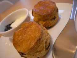 もちろん、ジャムとクロテッドクリーム付き。たいていはレーズンとクルミの2種類です。(たまに変わるかも?)